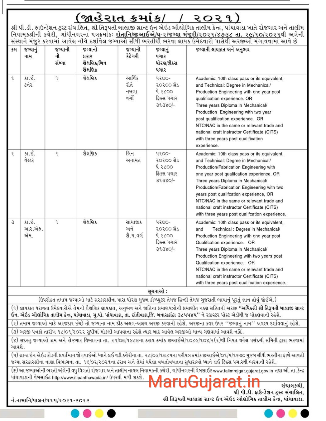 Shree Tirupati Balaji Grant-in-aid ITI Panthawada has published an Advertisement for the below-mentioned Posts. Other details like age limit, educational qualification, selection process, application fee, and how to apply are given below in the advertisement.